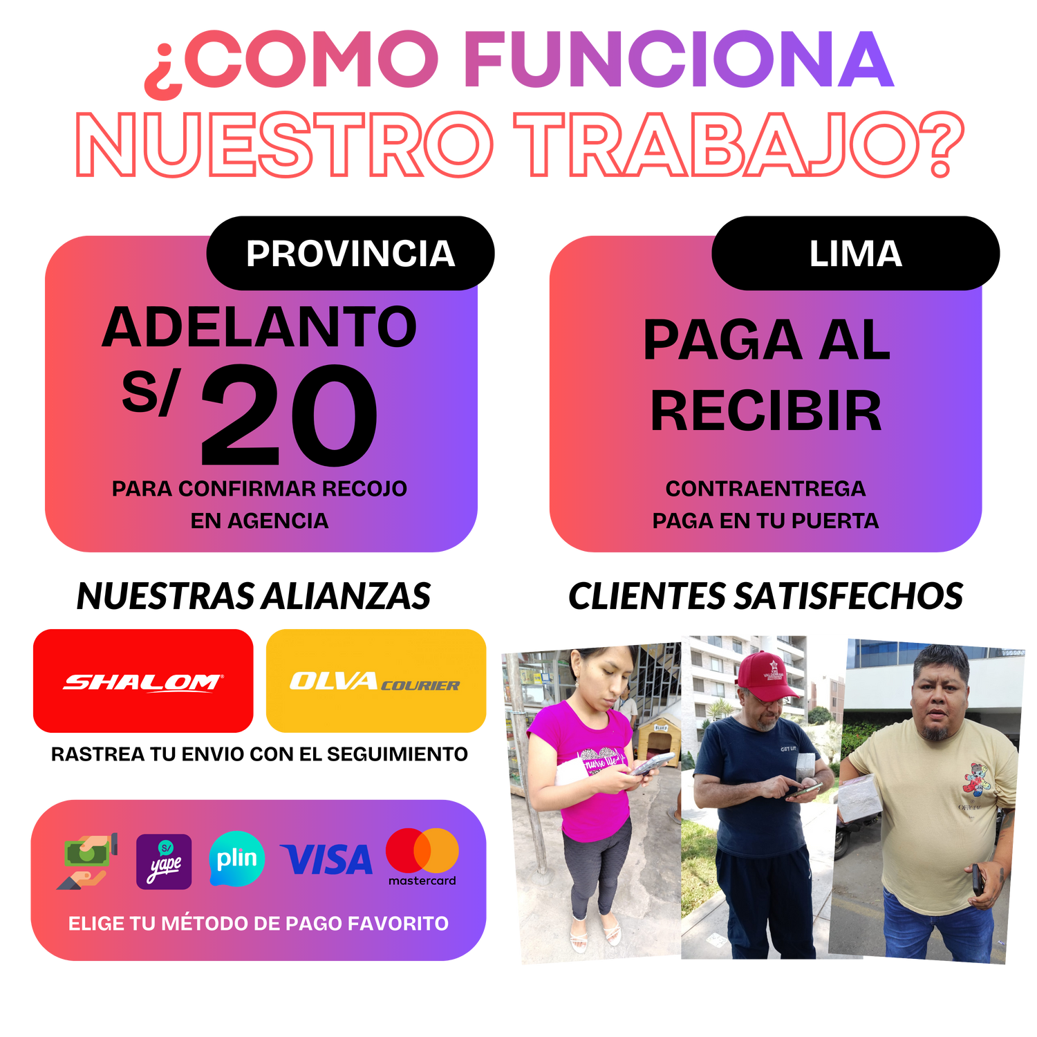 Los pagos se pueden hacer con efectivo siempre y cuando sea para Lima.